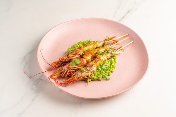 Обжаренные креветки на шпажках подаются с пастой птитим и соусом песто.