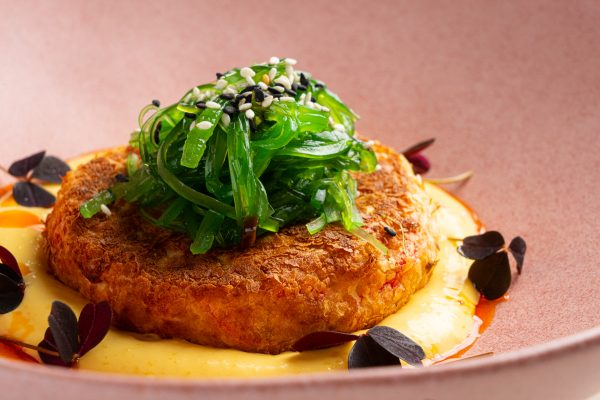 Краб кейк в панировке из картофеля на подушке из соуса манго, украшенный салатом чука.