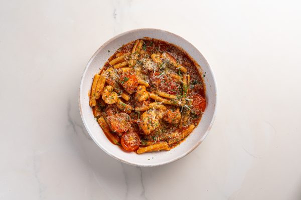 Паста казарече с креветками в томатном соусе, помидорами черри и пармезаном.
