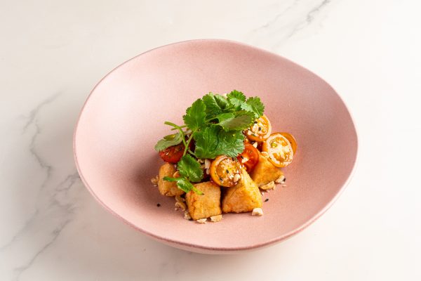 обжаренные хрустящие баклажаны подаются с томатами черри, кешью, азиатским соусом и кинзой.